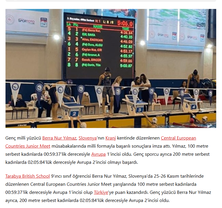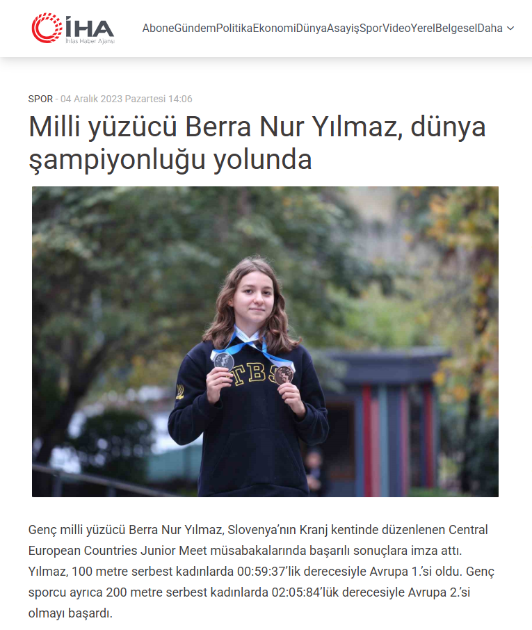 Okulumuz 9’uncu sınıf öğrencisi Berra Nur Yılmaz, Slovenya'da 25-26 Kasım tarihlerinde düzenlenen Central European Countries Junior Meet yarışlarında 100 metre serbest kadınlarda 00:59:37'lik derecesiyle Avrupa 1’incisi olup Türkiye'ye puan kazandırdı. Genç yüzücü Berra Nur Yılmaz ayrıca, 200 metre serbest kadınlarda 02:05:84'lük derecesiyle Avrupa 2’incisi oldu.
