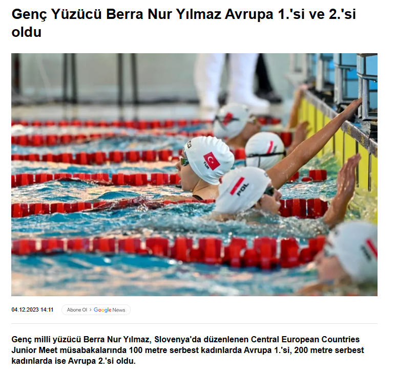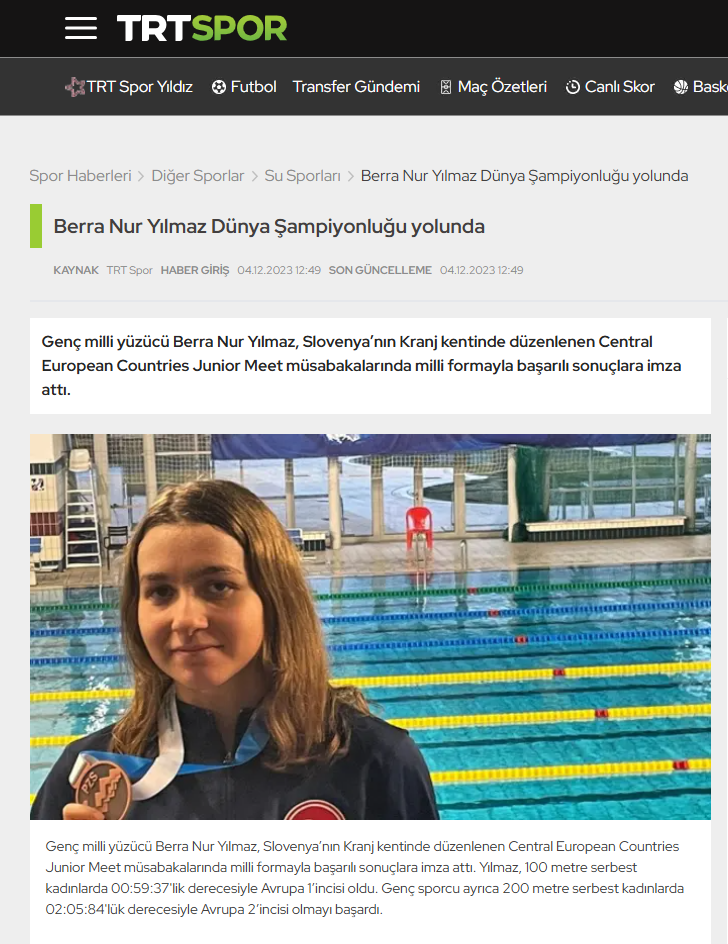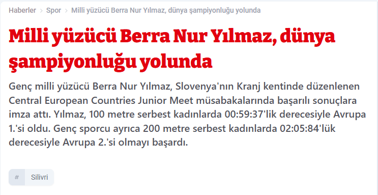 Genç milli yüzücü Berra Nur Yılmaz, Slovenya’nın Kranj kentinde düzenlenen Central European Countries Junior Meet müsabakalarında milli formayla başarılı sonuçlara imza attı. Yılmaz, 100 metre serbest kadınlarda 00:59:37'lik derecesiyle Avrupa 1’incisi oldu. Genç sporcu ayrıca 200 metre serbest kadınlarda 02:05:84'lük derecesiyle Avrupa 2’incisi olmayı başardı.